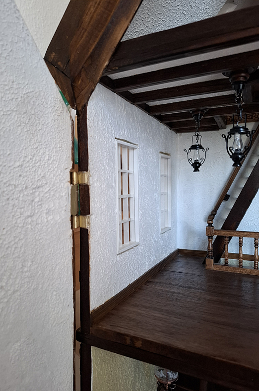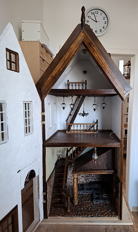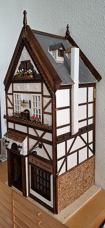 Nach dem Trocknen konnte das Dach an der Rückwand montiert, und der Treppenausschnitt der Stiege mit einem Geländer gesichert werden. Die übrige Dachkonstruktion steht noch aus, da wir auch noch Gauben und den Schornstein einplanen müssen. Der untere Teil des Hauses sieht schon richtig manierlich aus, während die obere Hälfte bis jetzt nur die Fenster eingesetzt bekam. Die Balkenköpfe sind mittlerweile schön mit Fachwerkleisten eingerahmt, was sich später oben am Dach wiederholen soll. Das anschließende Fachwerkmuster gibt der Fassade schon ein wenig Chic. Mal überlegen wie die obere Hälfte um die Fenster gestaltet werden kann.