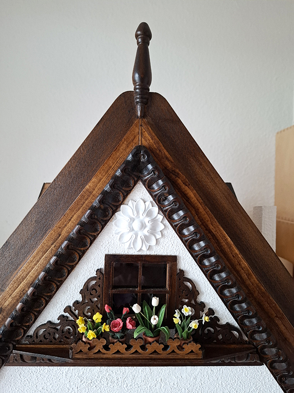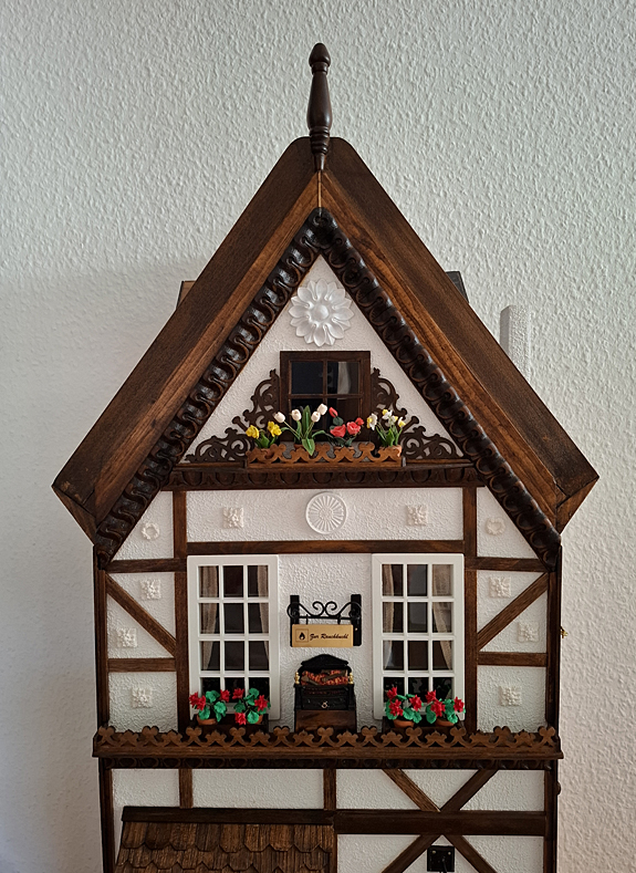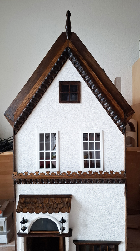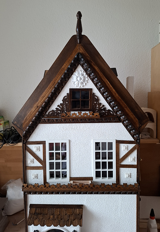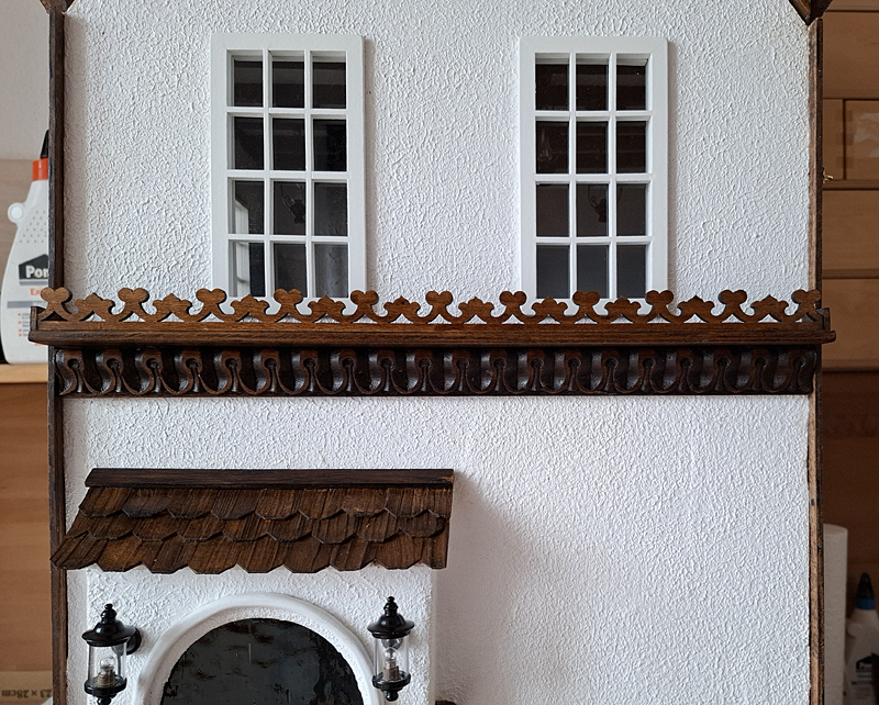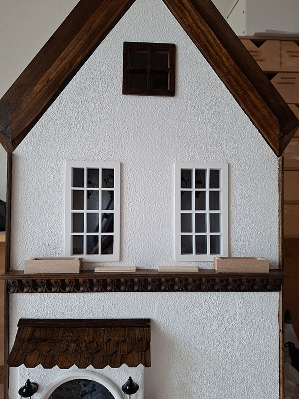 Alle Fenster sind mittlerweile eingeleimt, von denen teilweise noch die Innenleisten fehlen. Der Türstock inklusive Türe steht schon in den Startlöchern. Das Highlight ist natürlich der gedrechselte Giebelschmuck. Als Nächstes schwebt uns für die Vorderfront unter den beiden weißen Fenstern ein durchgehender nicht begehbarer "Balkon" für Blumenkästen vor.