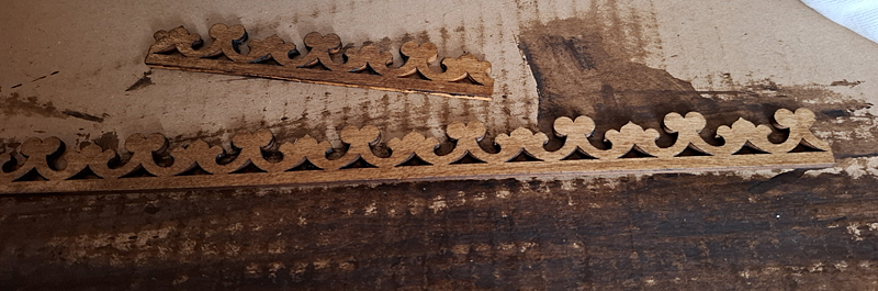 Für den Bau des Balkons schneiden wir für die Unterseite diese 36cm lange Schnitzleiste und als Auflage eine 3cm tiefe Hartholzleiste zu. Beide Leisten sind aus dem Baumarkt. Mit der flüssigen Wachsbeize von Clou grundieren wir beide Teile damit nach dem Trocknen das Briwax mit einem fuselfreien Tuch aufgetragen werden kann.