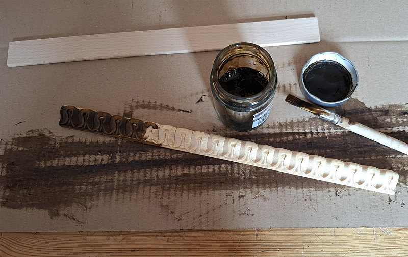 In der ersten Juliwoche konnten die Vierkantleisten mit einem Schnitzmesser so bearbeitet werden, dass sie nach dem Behandeln mit dunkelbraunem Wachs schön ALT aussehen.