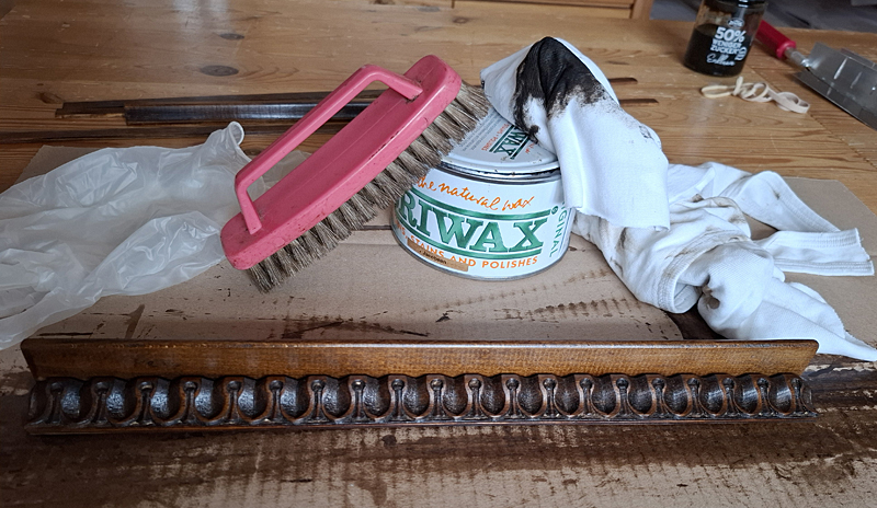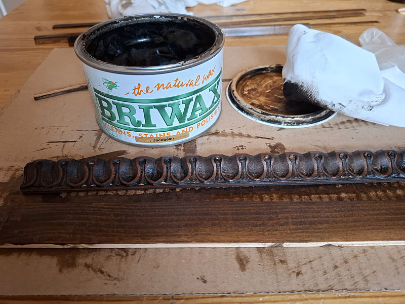 Dieses Ziergitter lag jahrelang in unserem Fundus, fand keine Verwendung. Die Leiste nimmt die flüssige Wachsbeize merkwürdigerweise nicht voll an, weswegen wir auch hier unser Briwax zum Finish auftragen.