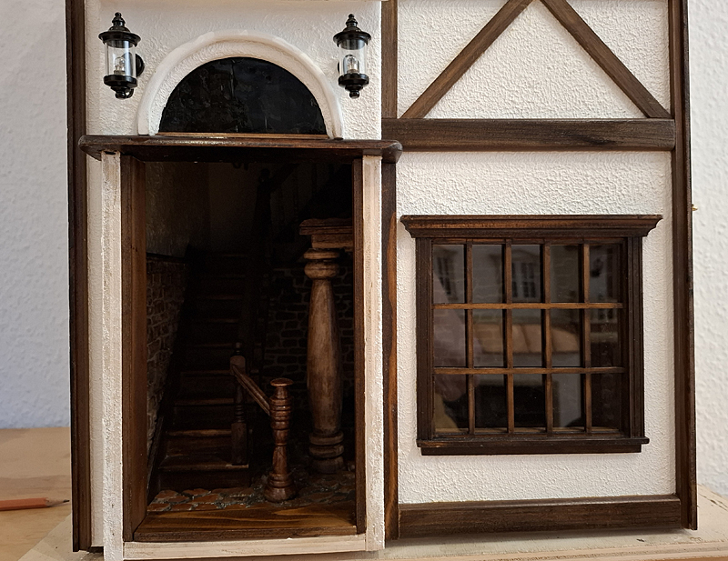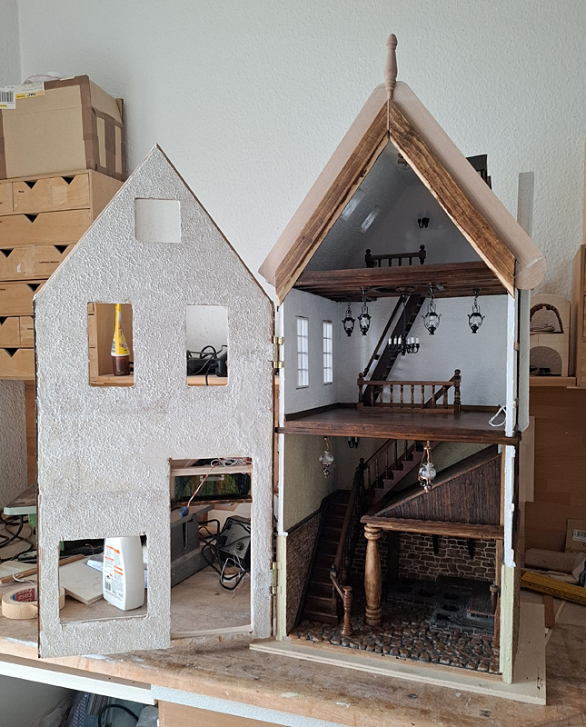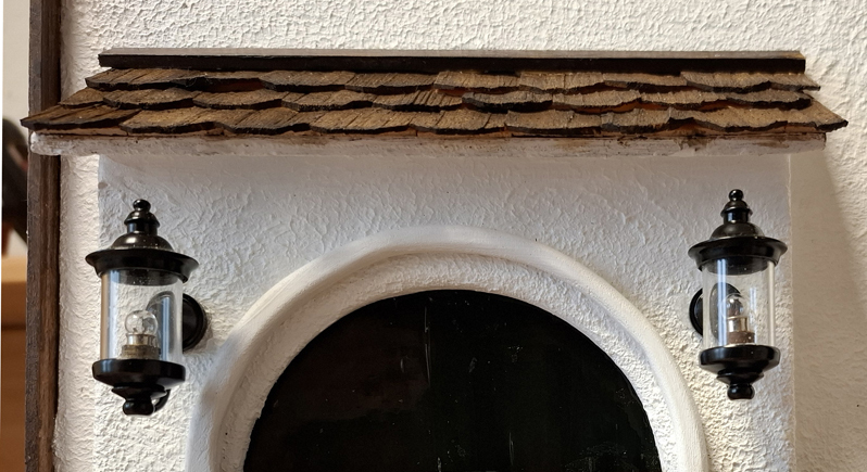 Das Dach über dem Eingang ist mit Schindeln gedeckt, die wir dunkelbraun gebeizt haben. Die beiden Außenlampen sind angebracht und leuchten. Was noch fehlt ist die Türe, die wir noch anfertigen. Nachdem uns die Türe beim großen Stadthaus gut gelungen ist, werden wir das schaffen.