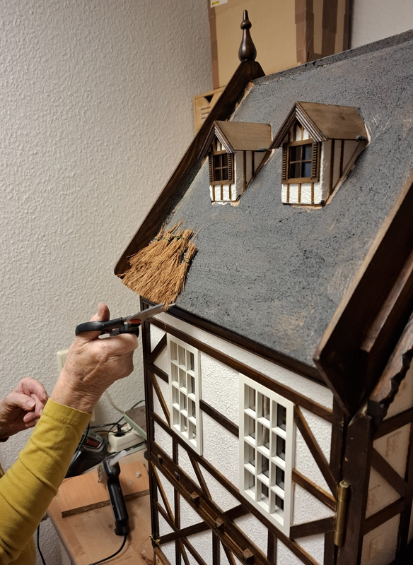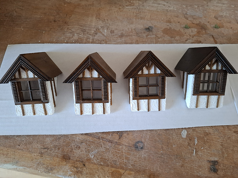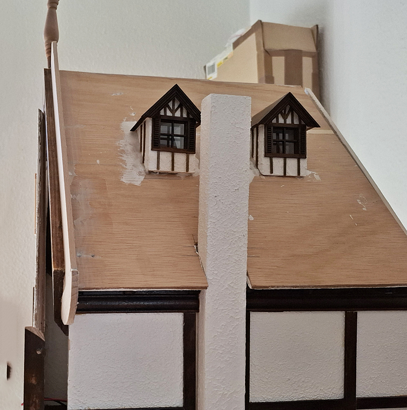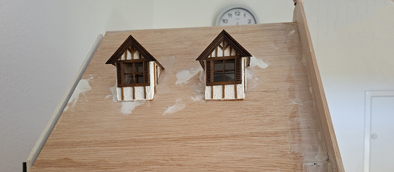 17./18.August 2024 Wir haben uns entschlossen im Dach vier kleine Gauben einzuarbeiten. Dabei haben wir bemerkt, dass das Dach keine 45 Gradneigung hat wie sonst standardmäßig üblich. So mussten wir der Not gehorchend alle vier Gauben der Schräge anpassen. Wir möchten diese Gauben unbedingt einbauen, da sie in der Größe 1:24 sehr gut dazu passen. Eine der Gauben haben wir bereits farblich gestaltet. Die Fassade und das Innere wie auch das Haus mit Leichtstrukturpaste und weiß gestrichen. Das niedliche Fenster, das herausnehmbar ist, haben wir mit brauner Wachsbeize behandelt und wieder eingesetzt. Es fehlt noch ein Stück Fensterfolie für die Innenseite. Vielleicht leimen wir noch ein paar dünne Leisten an, mal sehn.