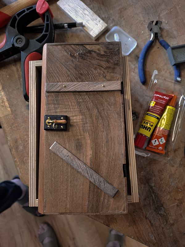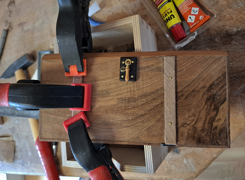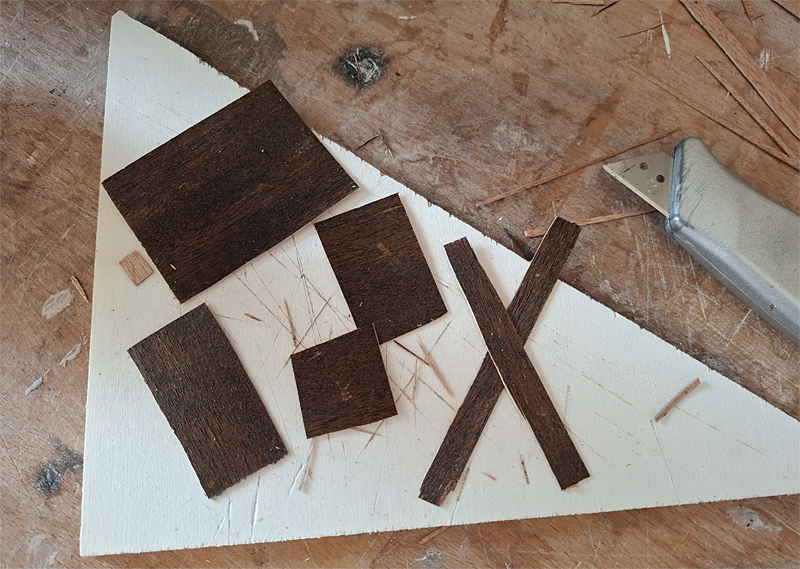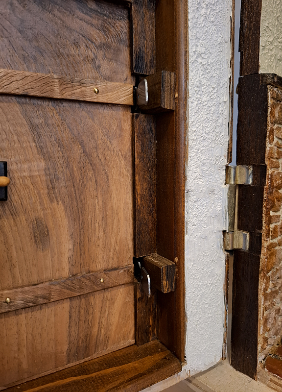 Da die Innenseite der Türe ein wenig kahl aussieht, bekommt sie noch zwei Leisten aus dem Furnier geschnitten in Höhe der Scharniere verpasst. Das Kastenschloss ist aus einer breiten Leiste geschnitten und dunkelgrau bemalt. Die Türklinke, die auch aussen angebracht, ist noch aus unserem Fundus.