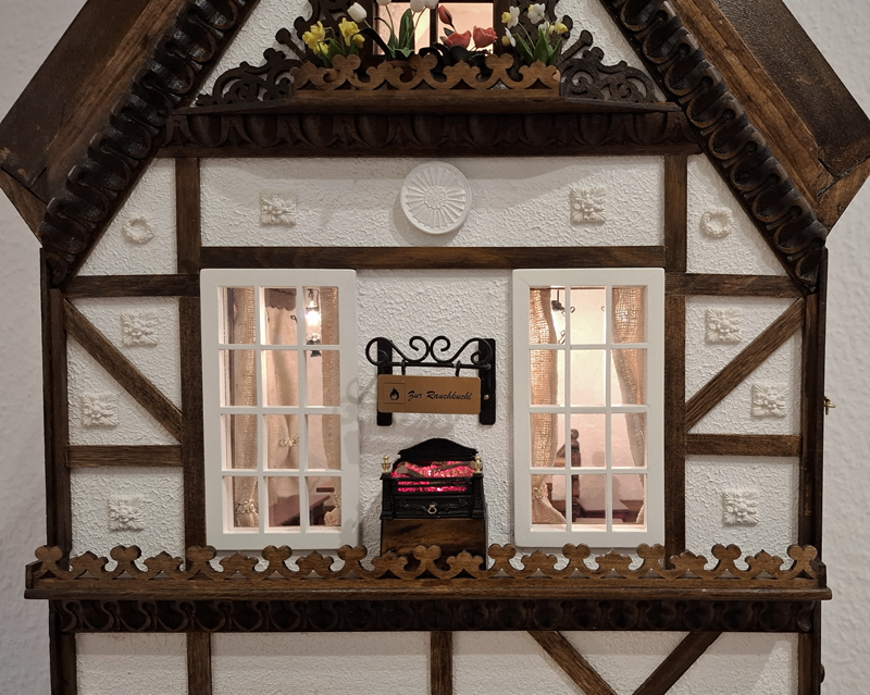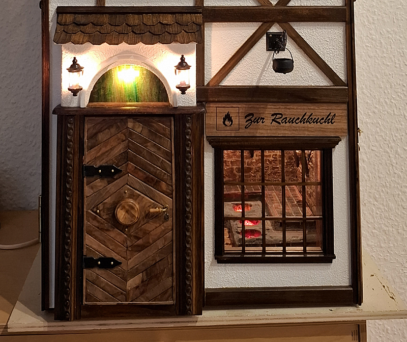Die Türpfosten haben wir beidseitig eingeleimt, sodass dem Einbau der Eingangstüre nichts mehr im Wege steht. Allerdings haben wir noch gar nicht damit begonnen, da wir sehr mit den Verzierungen für die Vorderfront beschäftigt waren. Zur Dekoration für die untere Hälfte des Hauses fanden wir einen passenden Haken, an den wir einen schwarzen Kessel hängen konnten. Unter die breite Leiste passte genau das angefertigte Holzschild mit der Aufschrift "Zur Rauchkuchl".