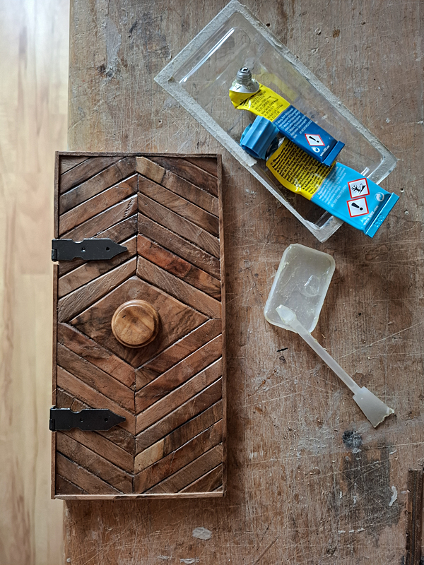 Und hier ist das Ergebnis nachdem die Türe mit farblosem Wachs behandelt wurde. Sie hat noch eine Umrandung aus Furnierstreifen und einen gedrechselten Zierknopf bekommen. Die Schmuckscharniere (Baumarkt) haben wir mit 2- Komponenetenkleber angebracht, um dann die Ziernägel einzustecken. Da die Türe sehr rustikal geworden ist, passen keine der üblichen Türklinken, da zu zierlich. Da müssen wir in unserem reichen Fundus stöbern, um etwas passendes zu finden.