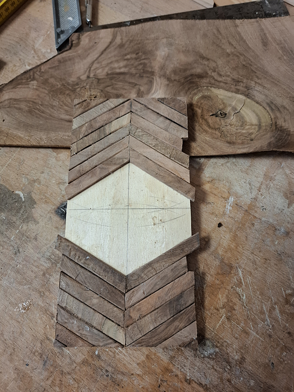 Anfang Oktober 2025: Die Eingangstüre haben wir 10,5 cm breit mal 20,5 cm hoch aus 5 mm dickem Sperrholz zugesägt. Für den Belag der Türe haben wir 2 mm dickes Furnier ausgewählt und daraus 13 mm breite Streifen mit entsprechender Gehrung gesägt. Diese wurden nach und nach jeweils oben und unten auf das Sperrholz geleimt. Alles was übersteht wird dann später angepasst. Die Ausbuchtungen für die Scharniere sind bereits vorbereitet.