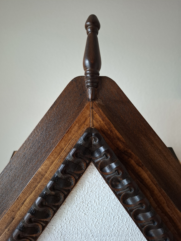 Hier sehen Sie beide Seiten der Vorderkanten schön versäubert. Den Giebel haben wir inzwischen ebenfalls gebeizt, gewachst und poliert. Die halbrunden Endstücke an beiden Seiten mussten wir entfernen, da diese die Vordertüre am Schließen hinderten. Wie hier zu sehen, haben wir auch hierfür eine Lösung gefunden um beide Giebelteile zu verbinden.