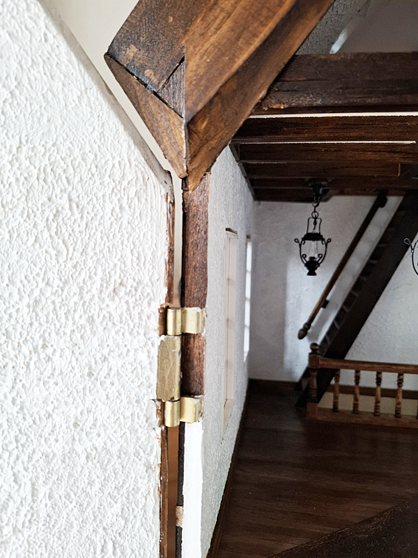 Um an an der Vorderfront des Hauses später eine Aussenbeleuchtung anbringen zu können, müssen wir jetzt die Vorrichtung dafür schaffen. Der Strom läuft in diesem Falle über die seitlich angebrachten Scharniere. Hierzu werden beide Scharniere, in diesem Falle versenkt, an der vorgesehenen Stelle mit Schrauben fixiert. Es wird mit Klingeldraht gearbeitet, der geteilt verwendet wird. Es ist zu beachten, dass ein entsprechend langes Stück Draht zur Verfügung steht. Der Draht wird jeweils an der Seite des Hauses bis zur Rückwand weiter geführt, um dann die Verbindung zum Transformator herstellen zu können.