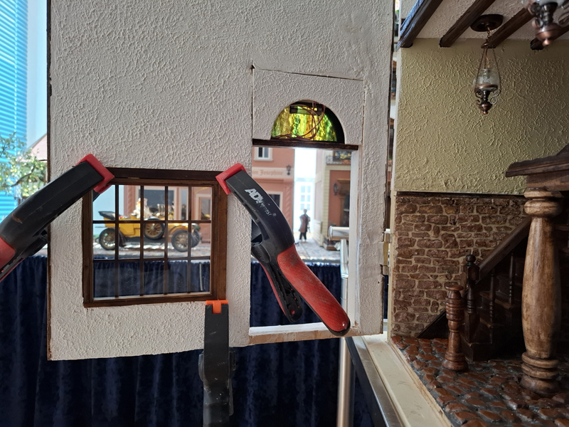 Hier geht es um das Sprossenfenster im Erdgeschoss, das schon sehr lange vorbereitet bereit lag. Das Acrylglas haben wir unter Mithilfe von dünnen Leisten befestigen können. Wenn versucht wird die Scheibe nur mit Leim in den Ecken zu befestigen, so geht das in jedem Fall schief, da der Kleber in die Scheibe läuft und hässliche Flecken verursacht. Das Fenster haben wir von außen eingeleimt, ging auch prima. Die Innenleisten, die ebenso vorbereitet waren, machten jedoch Probleme. Also, was tun? Die einzige Möglichkeit war zu versuchen Leimzwingen anzubringen. Und so schaut das dann aus. Die beiden fehlenden Innenleisten werden wir mit dieser Methode auch befestigen. So allmählich geht es an´s Schönmachen und Ausbessern. Anschließend werden wir uns um die Gestaltung der Vorderfront kümmern.