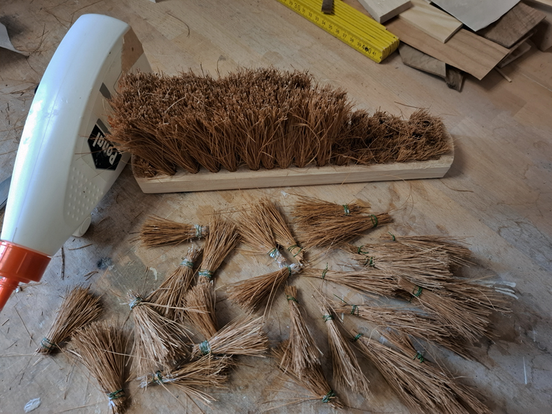 Und schon haben wir zwei Reihen geschafft. Allerdings müssen wir noch Material nachbestellen, da die zwei vorhandenen Besen nicht ausreichen werden.