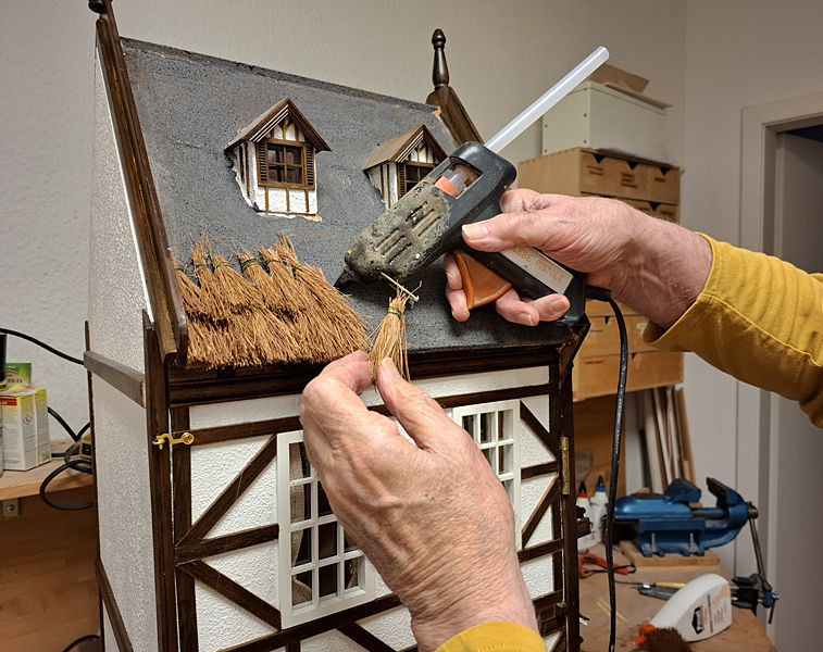 Im Bausatz lagen furnierte Sperrholzteile zum Herausdrücken, die wir entsprechend zugeschnitten auf das Dach leimten. Auf die Giebelseite