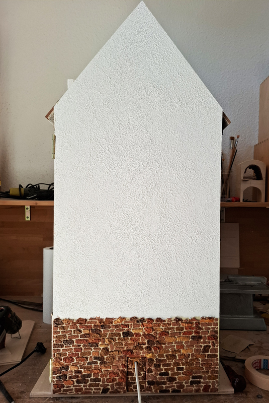 Nach langer Pause geht es nun endlich wieder weiter. Wir haben beschlossen, dass das Haus eine ordentliche Rückwand bekommt. Somit ist sicher gestellt, dass alle Kabel sauber untergebracht sind. Auch hier haben wir, wie ringsherum, Feldsteine simuliert, die bunt bemalt wurden. Für die Zuleitung zum Trafo haben wir auch ein Plätzchen gefunden.