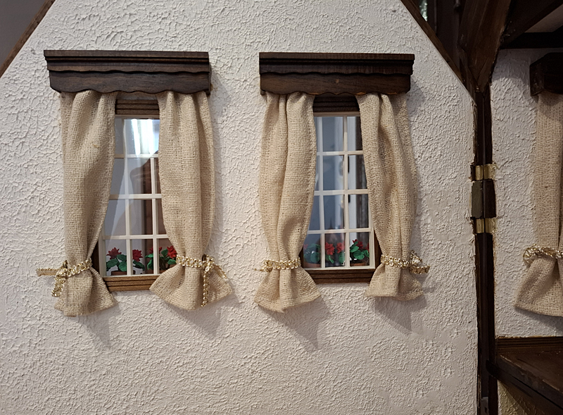 Inzwischen haben wir für die vier Fenster Vorhänge in beige aus grobem Leinenstoff gefertigt. Zur Befestigung kamen die übriggebliebenen Schabracken unseres großen Stadthauses infrage.