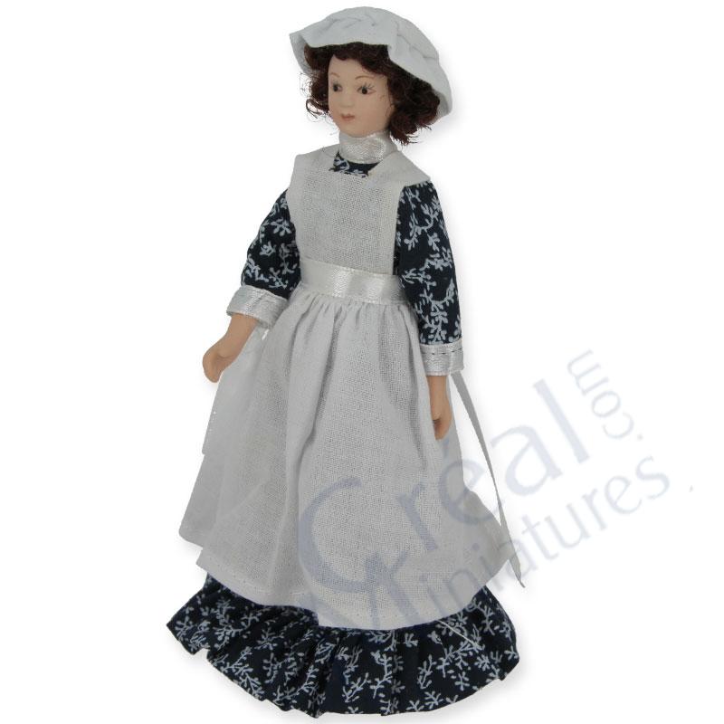 Die Puppe Nanny für das Puppenhaus trägt ein dkl.-blau gebustertes Kleid mit weißer Schürze und passender Mütze. Sie wird mit Ständer geliefert.