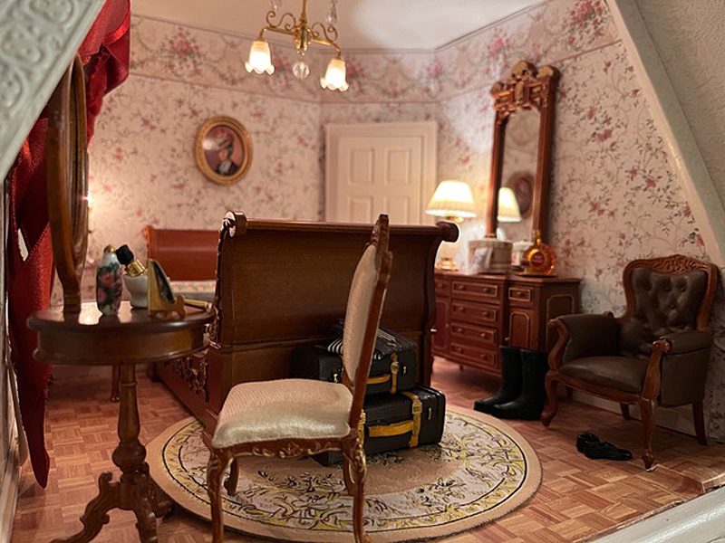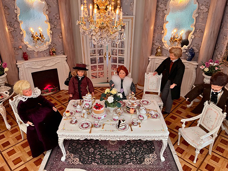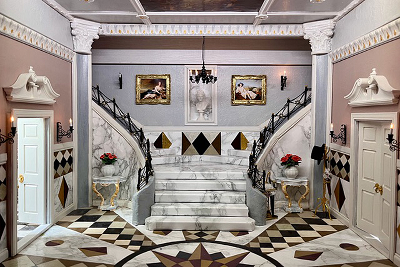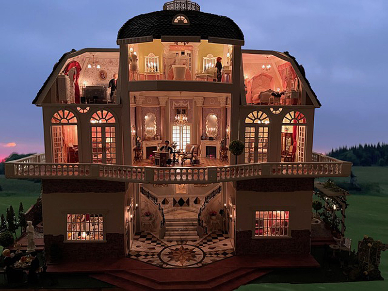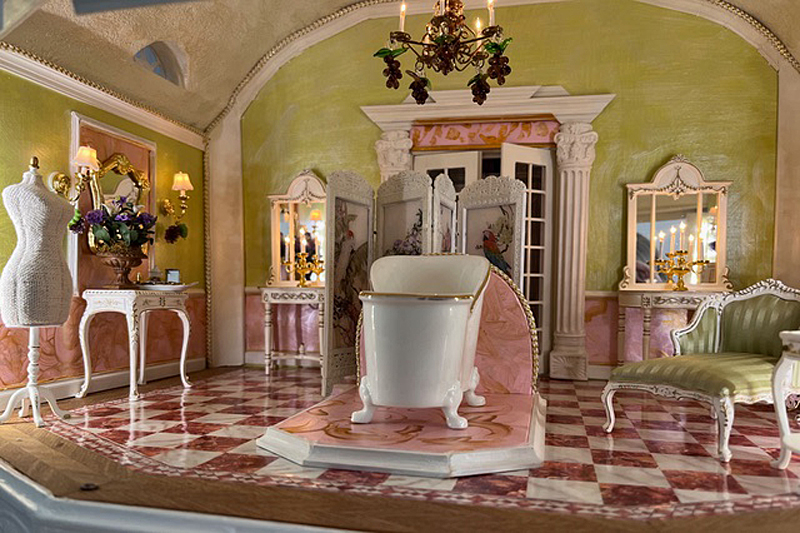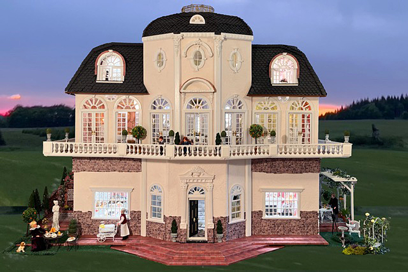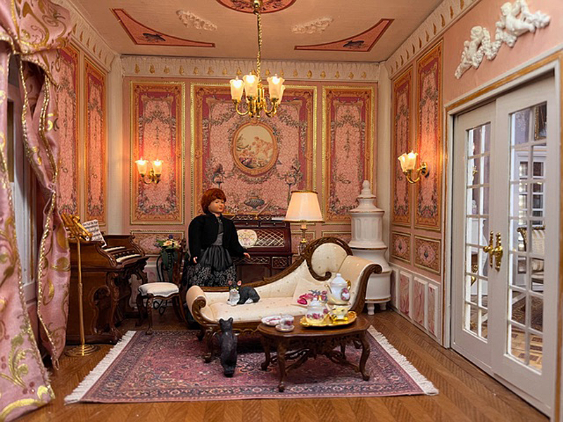 Sie schreibt: Baubeginn war 2016 mit einem Stapel Kiefer-Sperrholzplatten und der rosa Rokokotapete. Ziel war, die Anmutung der echten Solitude einzufangen und trotzdem ein Puppenhaus von üblicher Größe zu haben, in das man auch bei geschlossenem Zustand von allen Seiten hineinsehen und von einem Ende bis zum andern hindurchsehen kann. Die Vorderfront kann Raum für Raum entfernt werden, auch das Dach der Kuppel ist abnehmbar.