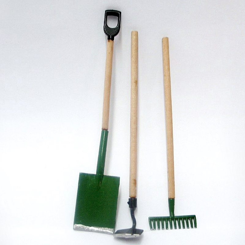 Das Gartengeräte-Set aus Holz-Metall besteht aus Spaten, Rechen und Harke. Es wird im Puppenhausgarten dekoriert.