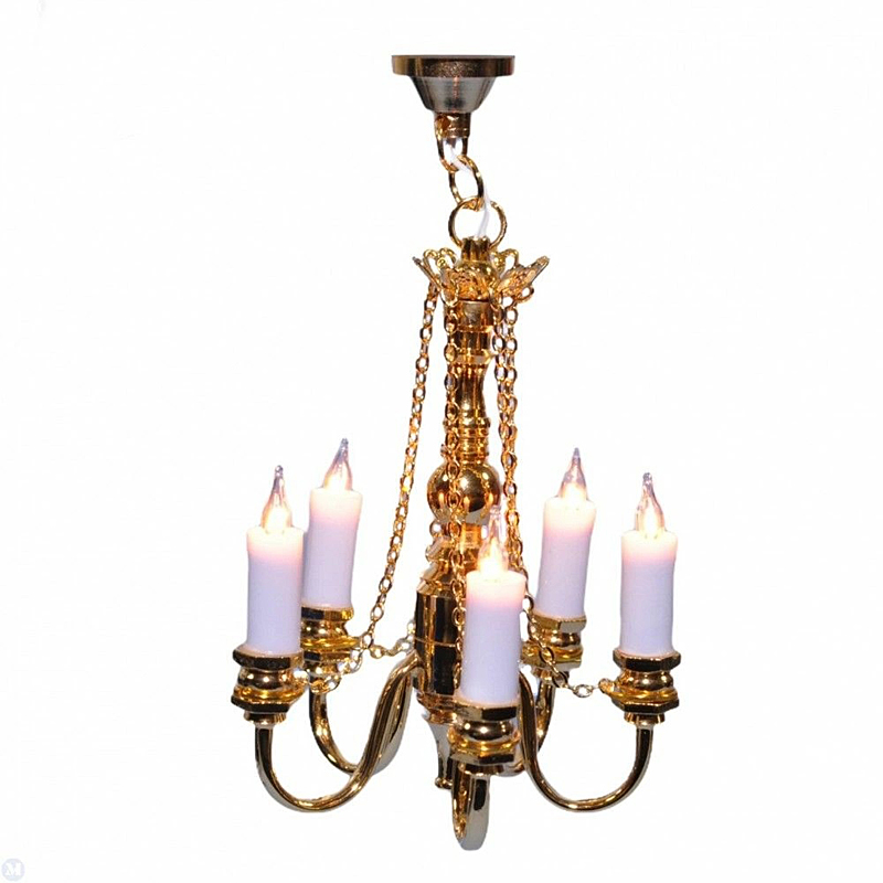 Dieser 5- armige Kronleuchter mit fünf Kettchen ist etwas zierlicher und passt somit auch in kleinere Puppenhausräume. Zum Auswechseln der Glühkerzen läßt sich die Kerzenhülse entfernen, so dass die Glühkerze frei liegt. Danach wird die Hülse wieder aufgesetzt.