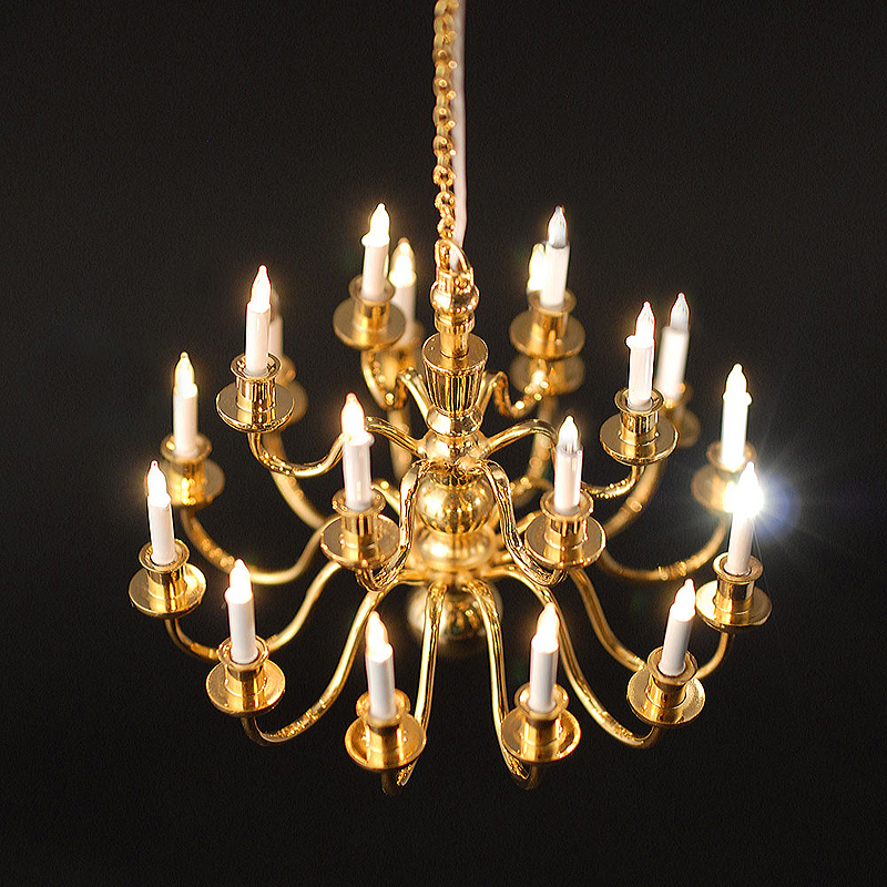 Der Kronleuchter, 18-armig für das Puppenhaus ist mit Schraubkerzen bestückt die auswechselbar sind. Die Kette kann nach Bedarf verlängert oder gekürzt werden. Der Kronleuchter ist ohne Kette gemessen ca. 6,5 cm hoch. Es liegen zwei Ersatzkerzen bei.