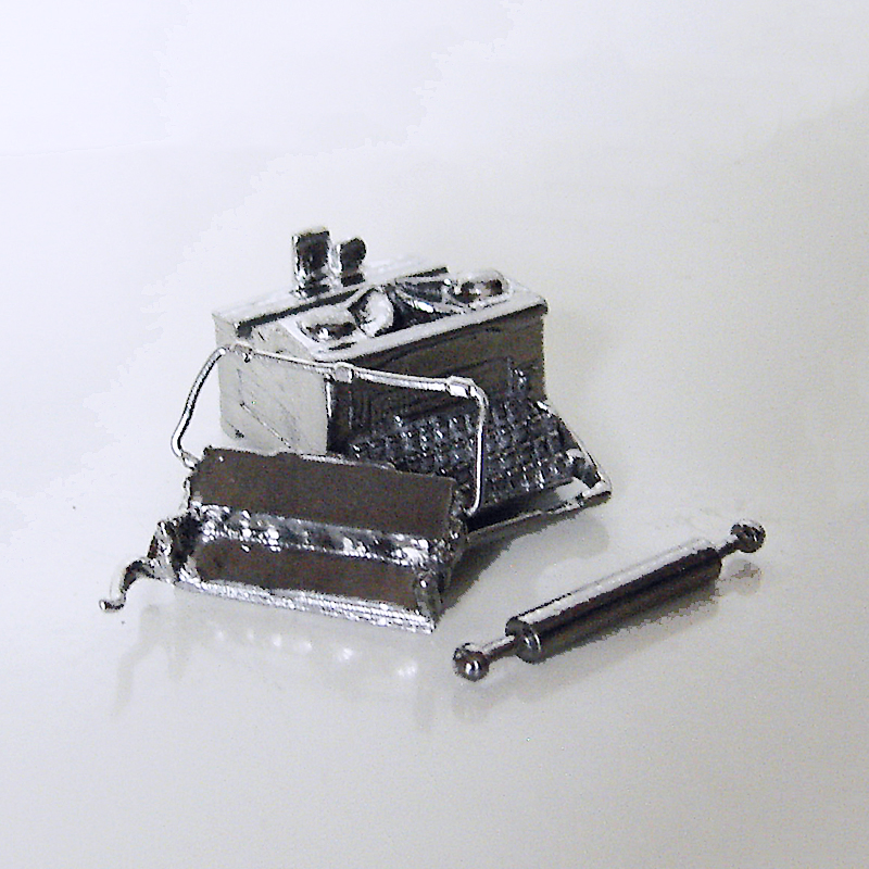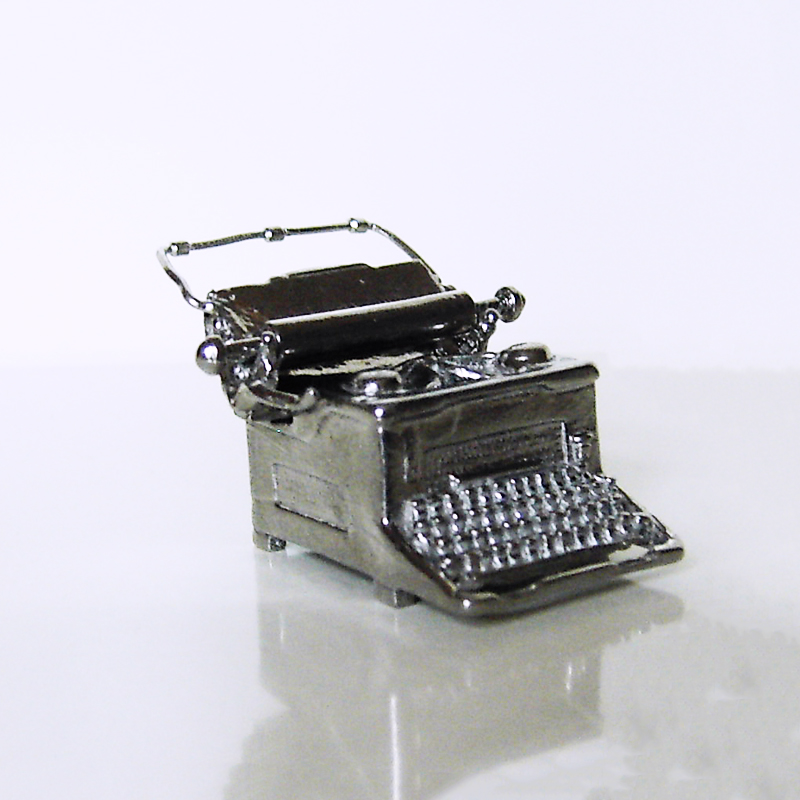 Eine täuschend echte Nachbildung der früheren Typen-Schreibmaschine. Wagen und Walze liegen extra bei. Der Wagen wird in die vorbereitete Rille gesteckt, dann wird die Walze für das Papier eingelegt. Der Wagen kann rechts oder links überstehend oder auch gerade auf die Maschine gesteckt werden. Sie wird im Puppenhaus-Arbeitszimmer dekoriert, sollte jedoch noch mit Humbrol-Lack bemalt werden.
