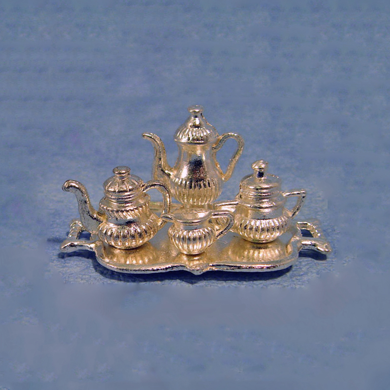 Das silberfarbene Teeset für das Puppenhaus besteht aus Zuckerschale, Milchkännchen und zwei Teekännchen mit Tablett.