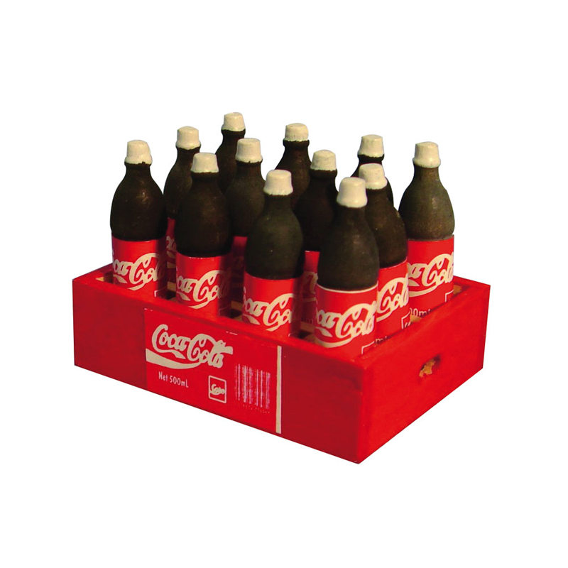 Die Kiste beinhaltet 12 CocaCola Flaschen zur Dekoration im Puppenhaus-Kaufladen und Gaststätte bzw. Bistro. Die Flaschen sind im Kasten fest fixiert.