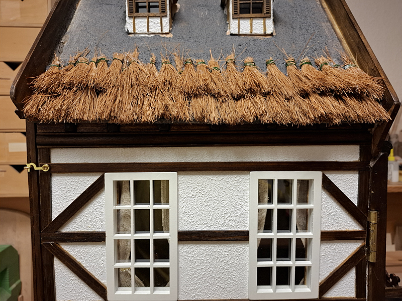 Alle Fenster sind mittlerweile eingeleimt, von denen teilweise noch die Innenleisten fehlen. Der Türstock inklusive Türe steht schon in den Startlöchern. Das Highlight ist natürlich der gedrechselte Giebelschmuck. Als Nächstes schwebt uns für die Vorderfront unter den beiden weißen Fenstern ein durchgehender nicht begehbarer "Balkon" für Blumenkästen vor.
